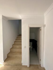 Spread over two levels, the ground floor of the villa features a spacious living and dining room, complete with a working fireplace, creating a warm and inviting atmosphere. From here, you can access the covered terrace and beautifully private garden, perfect for enjoying the Mediterranean climate.