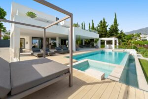 A striking contemporary villa in the heart of Nueva Andalucía, enjoying a privileged frontline golf position. With clean architectural lines, expansive terraces, and floor-to-ceiling windows, this home is designed to maximize natural light and uninterrupted views of the fairways, offering a seamless blend of indoor and outdoor living.