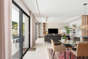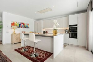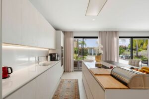 Welcome to this modern and very well built house in the lower Nueva Andalucia area. As you enter you are greeted with a large open kitchen that leads to the dining and living area, from here you can access the large covered terrace and onto the pool area with ample space for sunbathing and with an outdoor shower. On the main floor you have a bedroom onsuite currently used as an office. On the first floor you have 3 bedroom onsuite, all with access to a covered terrace. From here you have stairs leading onto the solarium which has been fitted with solar panels yet leaving space to create an entertaining space. In the basement floor floor you have the laundry area, a 2nd guest toilet, a bedroom suite, a large room that could be used as a cinema room etc and lastly a large garage for up to 4 cars. All floors are accessed by stairs or an elevator. The technology in the house is modern with water based underfloor heating powered by aerothermic system, the ac is thorugh the Airzone system, water filters & solar panels make this house very efficient to live in. A house in a very central position makes this a perfect all year living or a holiday home with the added bonus of being an attractive rental property due to its size and location.