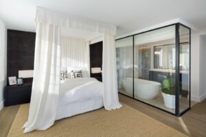The alfresco dining patio is perfect for entertaining, while the sunken fire-pit chill-out area is the perfect spot to relax. The sunbathing spot is ideal for soaking up the sun and enjoying the breath-taking views. The showstopper of the villa is undoubtedly the sunroof, offering unbeatable views and overall great vibes.