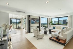 Inside, refined design meets timeless elegance. Every space is impeccably styled with bespoke furnishings and premium finishes by acclaimed interior design studio La Albaida. The open-concept living and dining areas enjoy seamless indoor-outdoor flow through large glass doors, flooding the home with natural light and connecting effortlessly to the outdoor terraces.