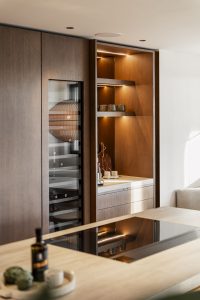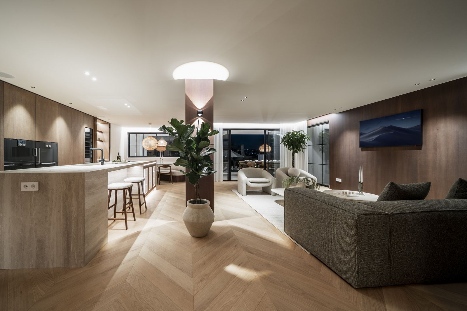 Inside, the home is defined by an elegant selection of materials, including Chevron wooden flooring that brings warmth and sophistication to every space. The Danespan kitchen combines clean design with functionality, creating a welcoming focal point for daily living and entertaining. The villa offers five spacious bedrooms, thoughtfully distributed to ensure comfort for family and guests. The wellness area features an indoor pool, sauna, and steam room, creating a private spa experience within the home.