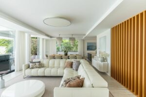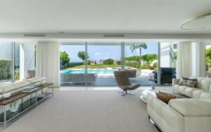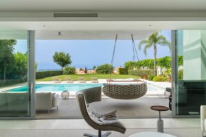 Entering through the impressive entrance hall, you are immediately greeted by views of the private pool, the well-kept garden and the sparkling Mediterranean Sea in the distance. Spacious floor-to-ceiling windows fill the house with abundant natural light, creating an atmosphere of space, luxury and harmony with the surroundings.