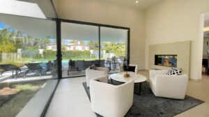 This villa has its own private swimming pool and garden with a bbq area, which you can access directly from the living room. The moment you enter this property you are welcomed by a stunning entrance hall that leads into the dining room, connected to the fully equipped, open-plan kitchen. The living room is divided into two areas, the TV area, and the fireplace area, both provided with plenty of seats. Each bedroom has floor-to-ceiling windows, filling the rooms with plenty of natural light, allowing you to enjoy the spectacular views and sunsets.