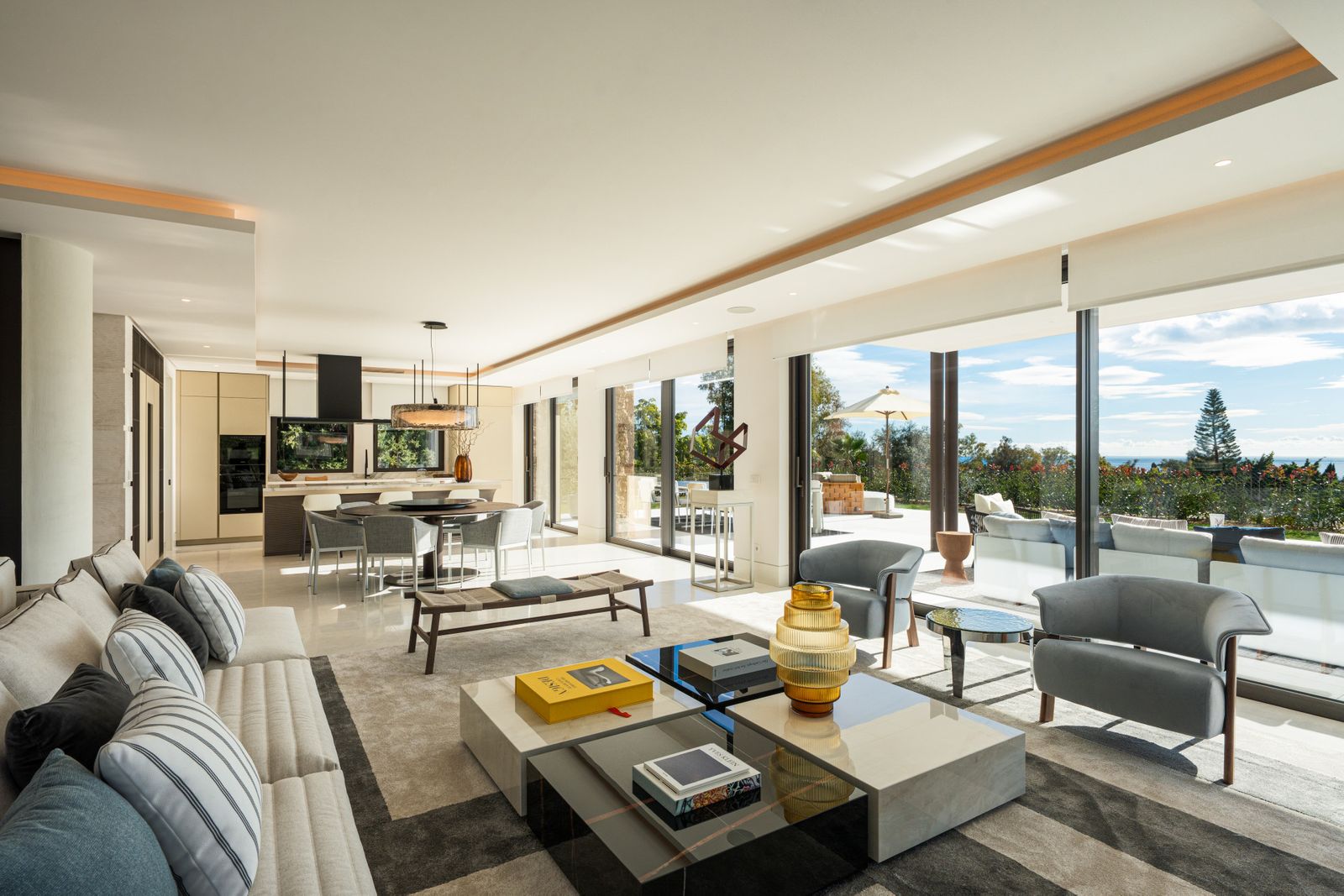A calming neutral palette, enriched with natural materials such as wood and marble, enhances the sense of understated luxury, while meticulous attention to detail elevates every space. The open-plan living areas are thoughtfully designed to create a harmonious flow while maintaining defined zones for relaxation and entertainment. The living room invites comfort and tranquillity, complemented by curated artwork and bespoke finishes that add character and individuality.
