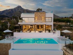 This outstanding contemporary residence, situated in the prestigious Marbella Hill Club just moments from the Golden Mile, embodies modern sophistication and architectural excellence. Designed by Villaroel and built by B Solis, it harmoniously combines natural stone, glass, and geometric precision across three levels, surrounded by lush gardens curated by Esspora. The result is a serene retreat that balances privacy, openness, and scenic beauty.