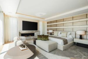 The main floor embraces an open-plan concept where living, dining, and kitchen areas flow seamlessly onto a spacious terrace overlooking the landscaped gardens and swimming pool—perfect for alfresco dining and relaxation. A secondary kitchen supports culinary convenience, while two en-suite guest bedrooms offer privacy and comfort. Every element of the interior, envisioned by Pedro Peña, reflects an elevated sense of style, from the curated furnishings and materials to the artwork that enhances each space.