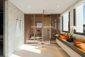 The upper level is reserved for the primary suite, complete with walk-in dressing room, luxurious bathroom, and terrace with panoramic views. An additional guest suite and serene home office complete this floor, all connected by an elevator. This residence epitomizes the highest standard of Marbella living, where contemporary design meets natural elegance.