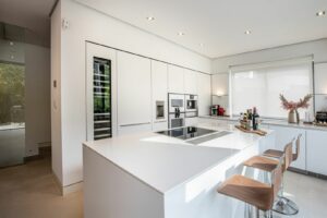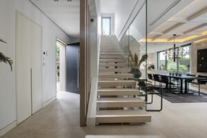 Inside, a bright and spacious living area features floor-to-ceiling windows opening directly to the terrace, garden and pool. A Bulthaup open-plan kitchen, fully fitted with the latest Gaggenau appliances, blends seamlessly into the space. A double-sided gas fireplace adds warmth and character, elegantly connecting the living and dining areas.