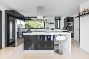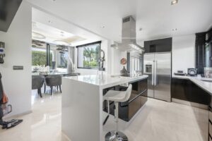 The kitchen is fully fitted with premium appliances and finishes, opening onto a tastefully appointed living space.