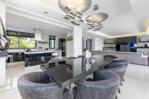 The main living area is thoughtfully designed for both comfort and elegance, featuring a spacious lounge and dining room that flow effortlessly onto expansive terraces and impeccably landscaped gardens.