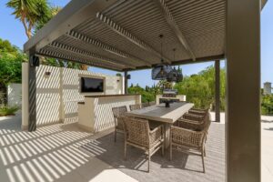 Outdoor living is elevated across 456m² of terraces that frame a large saltwater pool, sun deck, landscaped gardens, and a stylish al fresco dining area. Behind secure gated access, a covered carport accommodates up to six vehicles.