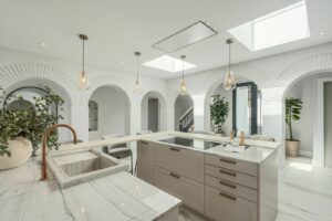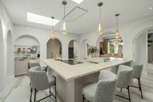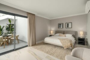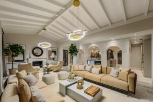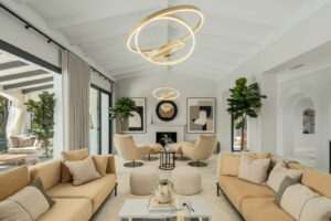 Inside, the villa enhances sophistication with its elegant use of natural tones and high-quality finishes. The expansive living area is highlighted by high ceilings with white-painted wooden beams, which enhance the villa’s Andalusian charm. This space seamlessly flows into the outdoor terrace, which includes a cozy lounge area, a dining table, and a barbecue zone, offering a wonderful setting for al fresco dining.