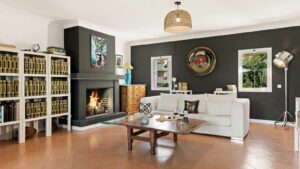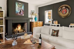 The interior layout is open and inviting, designed with comfort and style in mind. To the left of the entrance, a spacious living room features a grand fireplace, adding both warmth and sophistication. A convenient outdoor laundry area complements the fully equipped kitchen.