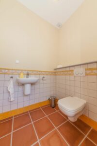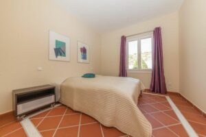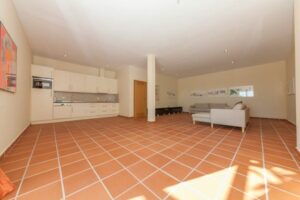 The independent guest apartment has its own entrance and also connects to the garage. Inside, there is a hallway leading to an open-plan living and dining room with fitted kitchen and access to the garden and pool. The apartment has two double bedrooms, both with fitted wardrobes and doors to the garden, sharing a bathroom and separate WC. There is also a large gym or family room and two storage rooms.