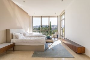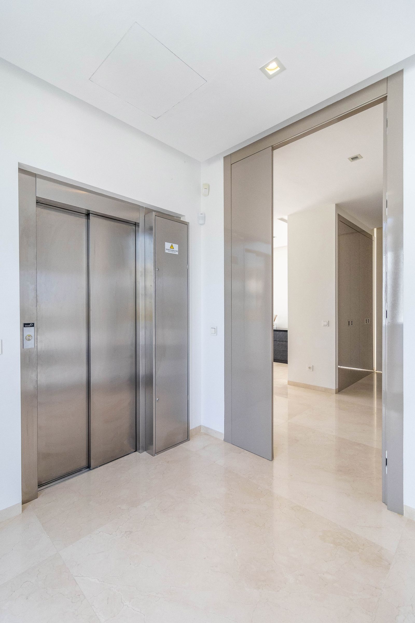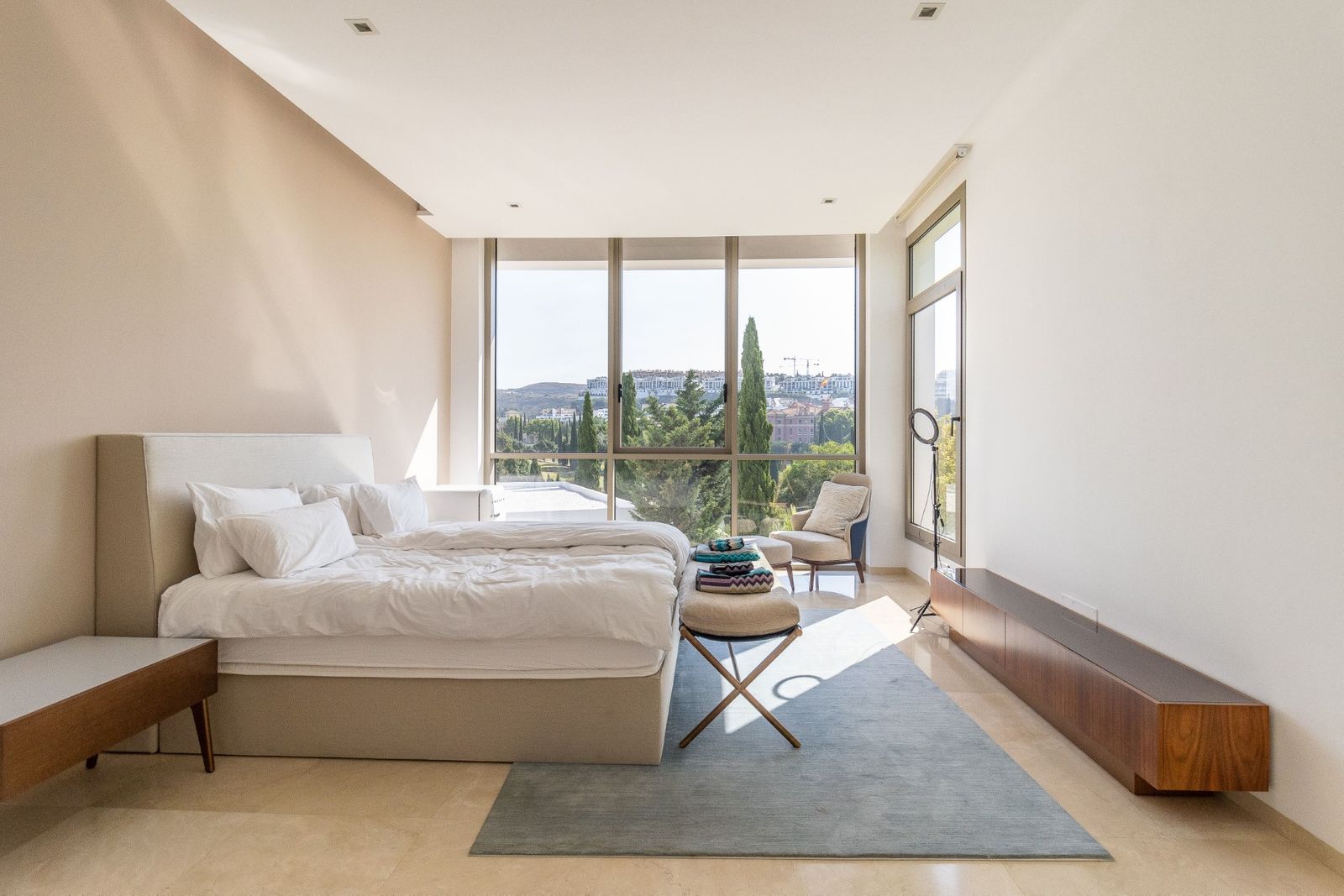 Upon entering the property on the first floor, you are captivated by the breathtaking panoramic views and the expansive glass facades of the villa. This level boasts a fully fitted kitchen with top quality appliances, a spacious living and dining area enjoying the views, and several bedrooms. The property also includes a private lift for easy access to all floors. On the lower floor, garden level, there is another open plan kitchen with large breakfast bar, leading into the living area that continues onto the terraces and gardens, plus additional bedrooms. The top floor boasts the master bedroom suite plus another guest bedroom, a solarium terrace, perfect for enjoying the stunning views.