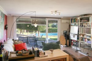 Built on a corner plot of 914 square meters, this house features a ground floor comprising an entrance hall, a living room with a fireplace and a magnificent bookcase that adds character to the space, opening onto the garden area with a glazed rear terrace perfect for enjoying the wonderful temperature both in winter and summer. A spacious dining room adjoins the functional kitchen with a utility area and access to the side of the garden and barbecue area, as well as a room facing the garden that can be used as an office or bedroom, and a guest toilet. The first floor comprises a spectacular master bedroom with ample built-in wardrobes and an ensuite bathroom with shower, and a large glazed terrace with panoramic sea views. Three further functional bedrooms and a full bathroom are also located on this floor. With direct access from the house as well as a separate entrance from the outside, the lower level features a 45-square-meter room that has been converted into a studio with its own bathroom. This bright and independent space offers direct access to the pool area and the magnificent garden surrounding the property, boasting mature vegetation. The spectacular views, which change throughout the day, particularly at sunrise and sunset towards the African coast, are a hallmark of this up-and-coming area, perfect for enjoying a home year-round or for holiday getaways.