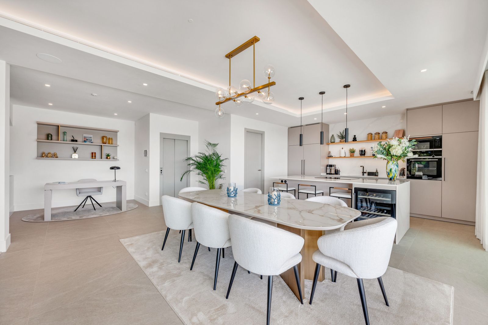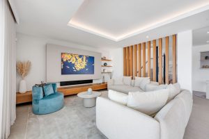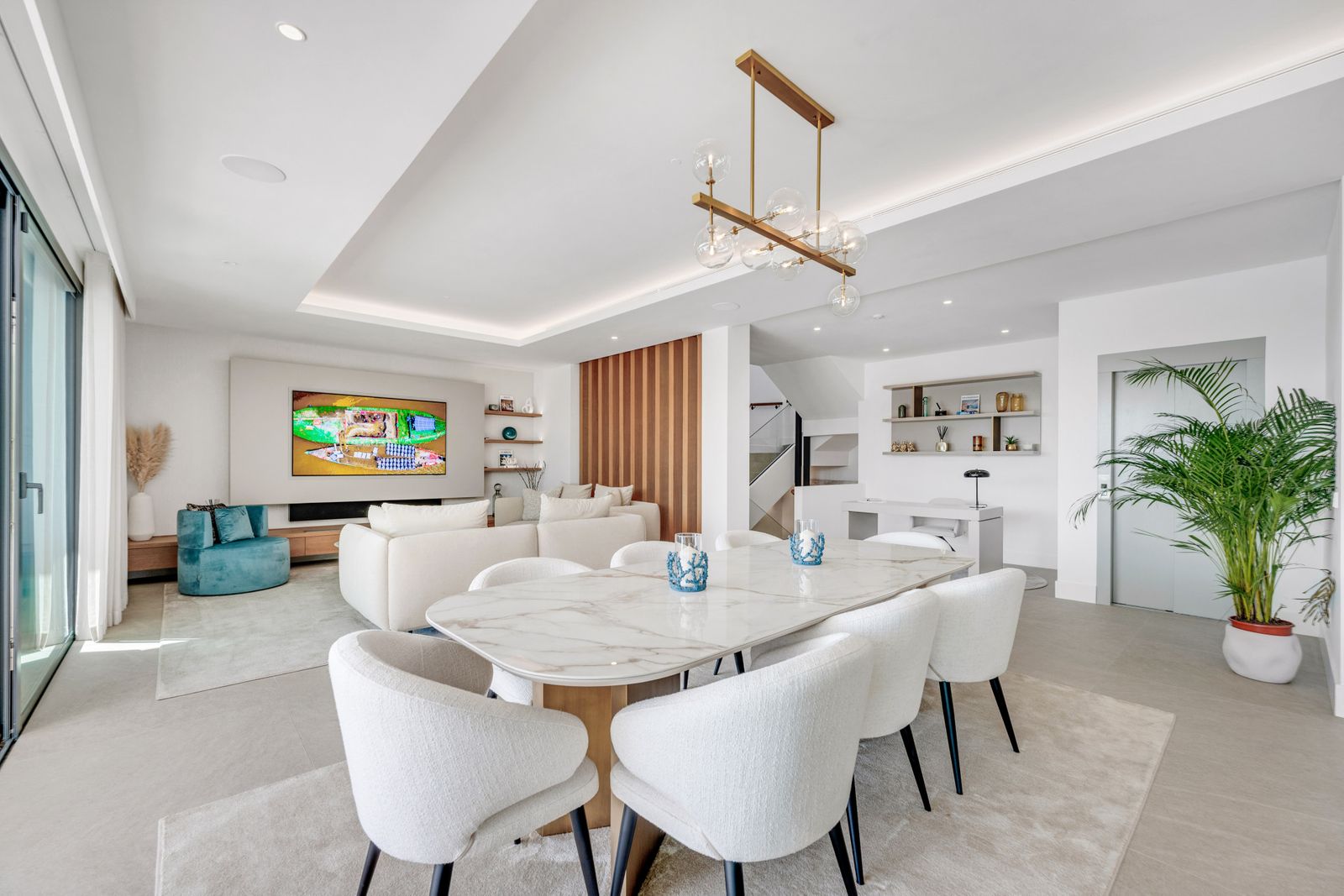 A private driveway leads to the top-floor entrance, where sweeping views of the Mediterranean and La Resina Golf Course immediately set the tone. Clean architectural lines, abundant natural light, and striking geometry create a stunning first impression.