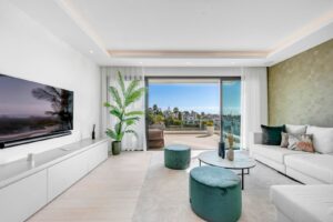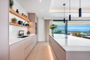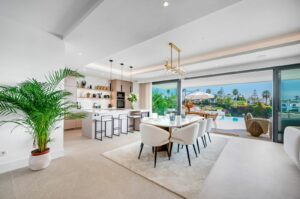 A private driveway leads to the top-floor entrance, where sweeping views of the Mediterranean and La Resina Golf Course immediately set the tone. Clean architectural lines, abundant natural light, and striking geometry create a stunning first impression.