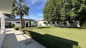 The light-flooded rooms with floor-to-ceiling windows offer a magnificent view of the well-tended garden with an impressive plot of 2,600 m².