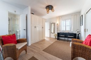 Externally, the villa offers a private swimming pool surrounded by a beautifully maintained, easy-care garden. Additional features include a guest apartment, fitted wardrobes, ensuite bathrooms, a dedicated storage room, barbeque area, private terraces, and covered parking.