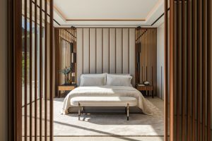 Inside, the villa features exclusive furniture by Aalto Exclusive Design, delivering a cohesive aesthetic defined by natural tones, high-end materials and bespoke detailing. The main living area is expansive, bright and designed for flow, with large sliding panels that open the entire space onto the terrace. Integrated lighting, refined textures and carefully curated furnishings create an environment that is both functional and visually impactful.