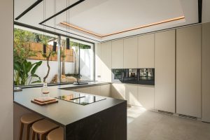 The kitchen and dining areas continue the same standard of design, offering a sleek layout with premium appliances, generous workspaces and ample storage. The open-plan configuration allows direct interaction with the living room and terrace, making the main level ideal for both daily living and entertaining. Large windows frame the exterior landscaping and views, turning every room into a vantage point.