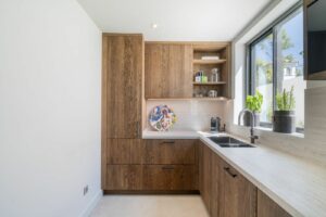 The open-plan main floor is tailored for modern living, featuring a bright and stylish lounge alongside a bespoke Swedish kitchen fitted with premium Miele appliances, dark oiled Oak cabinetry, and sleek Dekton countertops. The adjacent dining area is perfect for both intimate family meals and entertaining guests.