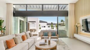 The villa is built mainly all on one level plus lower level, quite rare to find on the market. It has a fresh, modern feel throughout. Decorated in a soft, neutral palette, it feels relaxed, luminous and welcoming.