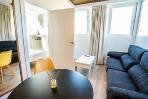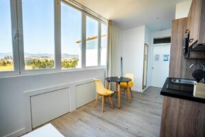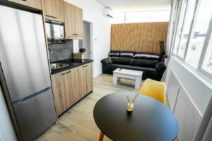 Each studio apartment offers a modern living-dining area, a fully functional kitchen, a cozy bedroom, and a sleek bathroom, catering to the needs of today’s discerning travelers.