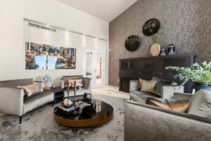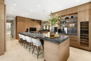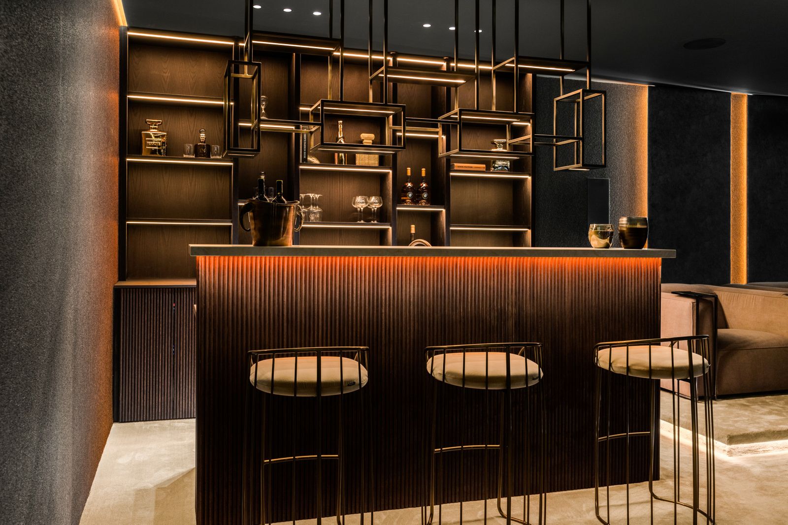 The lower floor offers an extraordinary luxury cinema room, a chic bar perfect for entertaining, a fully equipped Eleiko gym, a rejuvenating sauna, a private office for ultimate productivity, two additional guest bedrooms with en-suite bathrooms, and an expansive garage offering space for five cars, all designed with the finest attention to detail.
