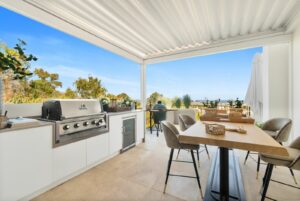 The interior of the home is equally impressive, with the main living room showcasing vaulted ceilings that create a sense of grandeur. A spacious dining area and a second living room provide ideal spaces for both formal and casual gatherings. The kitchen is equipped with high-end Gaggenau appliances, ideal for culinary enthusiasts. Stepping outside, the villa opens to an expansive terrace with a stylish lounge area, seamlessly connecting to the heated swimming pool. The south-facing orientation ensures an abundance of natural light throughout the day. This stunning villa also features a beautiful barbecue area, perfect for outdoor dining and entertaining while enjoying the spectacular views.