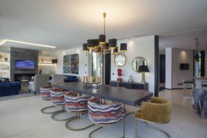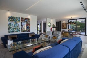 Fantastic contemporary villa with mountain views in Parcelas del Golf, a private and secure residential area in the Golf Valley of Nueva Andalucía. Distributed on three levels, this luxury villa offers spacious interior spaces bathed in natural light extended by huge terraces leading to a large swimming pool and superb Mediterranean gardens, an ultramodern kitchen fully equipped with high-end Balay appliances, 7 bedrooms, 6 bathrooms, one of the bedrooms with two windows overlooking the lower level with a view of the cars. Lift to all levels, 200-m2 solarium, BBQ area, Jacuzzi, rare stone construction from Portugal and outdoor parking for 5 cars. A sublime property in an exceptional setting only 5 minutes' drive to Puerto Banús, the beach and all amenities.