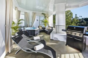 A spacious roof terrace features a blockhouse, a gym and The villa comes with a heated Swimming Pool with Jetstream, a Golf Putting Green, a Finnish Style Outdoor Sauna and BBQ Area. With a bike storage, & ATV and Buggy Parking.