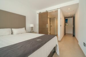 The first floor boasts a spectacular open-plan lounge filled with natural light throughout the day thanks to its east-west orientation, with access to balconies overlooking the pool. A second designer kitchen fitted with premium Neff appliances completes this floor. The master suite is truly exceptional, offering a walk-in wardrobe, two separate bathrooms, Villeroy & Boch porcelain finishes, a rain shower and a hydromassage bathtub.