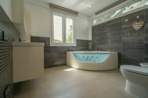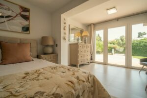 The villa features 8 double bedrooms and 8 bathrooms, all en suite, with direct access to the garden through triple-glazed patio doors. Its layout allows the spaces to be easily adapted into offices, a gym, playrooms or private studios.