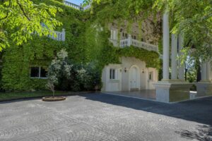 From the moment you arrive, the home makes a statement. Grand Doric columns frame the entrance, and ivy-covered walls soften the architecture, giving it a quiet, almost cinematic beauty. The double-height entryway, with its sweeping twin staircases and patterned marble floor, sets the tone: formal but warm, impressive yet inviting.