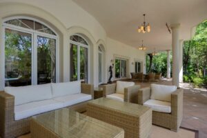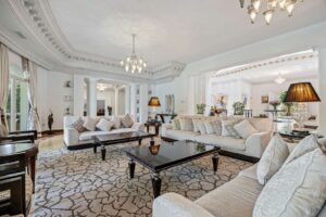 The estate sits on over 4,000 square meters of private grounds, and offers more than 1.500 square meters of interior space laid out across three levels. The main floor is designed for entertaining, with generous reception rooms, elegant ceilings, and natural light pouring in through large windows that open to the terraces and garden beyond.