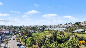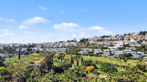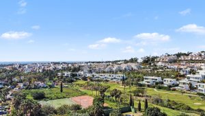 From the site, the panoramic views take in an exceptional landscape: to the north, the imposing silhouette of the Serranía de Ronda mountains; to the south, glimpses of the Mediterranean shimmering between the rooftops; and in the foreground, the perfect green carpet of the golf course flanked by luxury villas and ancient trees. The club's sporting facilities — clay tennis courts, golf course and landscaped gardens — are clearly visible from the plot, reinforcing the exclusive country club character of this setting.